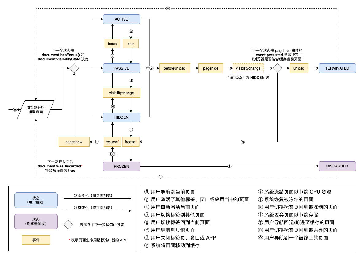 一个 Web 页面的生命周期指的是页面从开始加载到完全卸载的过程中经历的所有状态及状态转化,主要包括了焦点、可见性、页面缓存等内容。Web 页面的完整生命周期所有的状态及状态转化可以参考下图: